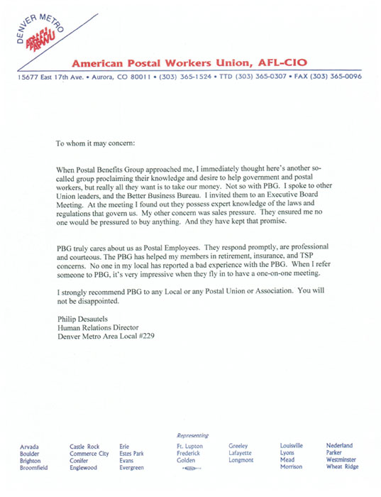 "When Postal Benefits Group approached me, I immediately thought here's another so-called group proclaiming their knowledge and desire to help government and postal workers, but really all they want it to take our money. Not so with PBG. I spoke to other Union Leaders, and the Better Business Bureau. I invited them to an Executive Board Meeting. At the meeting I found out they possess expert knowledge of the laws and regulations that govern us. My other concern was sales pressure. They ensured me no one would be pressured to buy anything, and they have kept that promise.