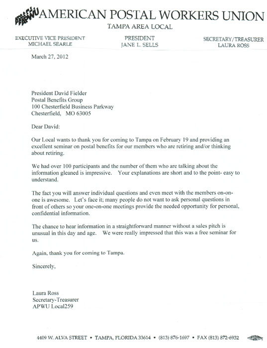 "Our Local would like to thank PBG for coming to Tampa on February 19 and providing an excellent seminar on postal benefits for our members who are retiring and/or thinking about retiring.